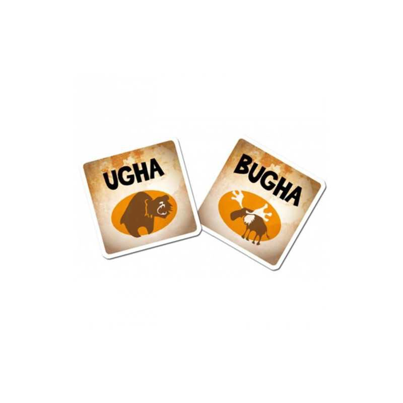 En Ouga Bouga, los jugadores deben repetir una serie de ruidos guturales y luego agregarlos a la cadena. Al comienzo de cada ronda, los jugadores reciben tres cartas boca abajo y esas cartas permanecen ocultas; cada tarjeta muestra una «palabra» y una ilustración asociada: «Miti» para mamut lanudo y «Atrrr» para fuego. El primer jugador de la ronda coloca una carta en el centro de la mesa, hace el ruido y luego señala a otro jugador diciendo «¡Ja!» Ese jugador debe agregar una carta, repetir ambos sonidos en orden y luego elegir a alguien que no sea el jugador que lo eligió. Algunas cartas tienen acciones y añaden un gesto como sacar la lengua o golpear la mesa.